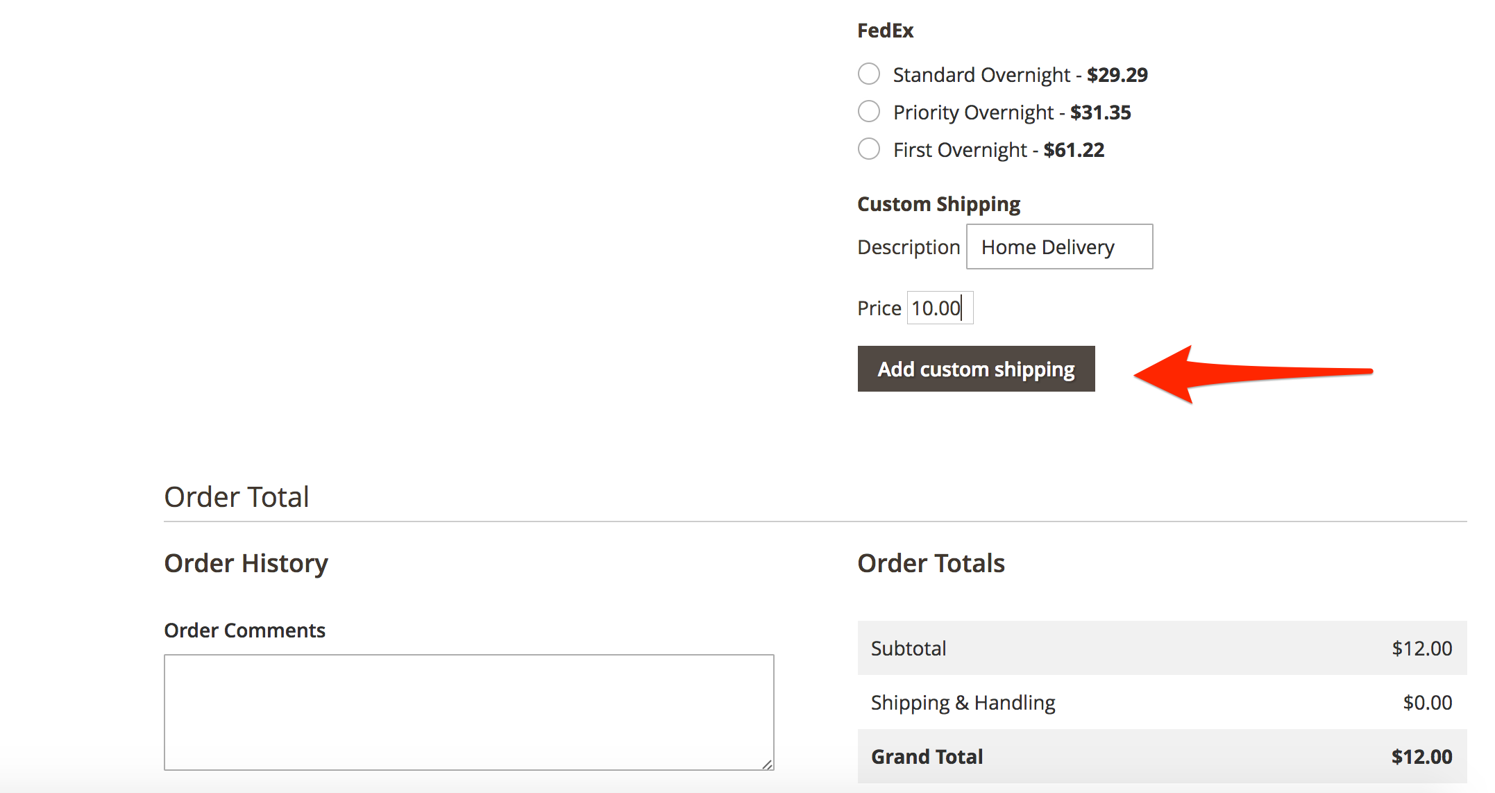 - For Magento 2: Click the Add Custom Shipping button. You must click this button before you submit the order.