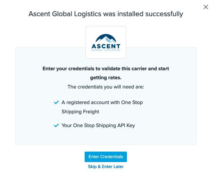 Once you enter your username and password, ShipperHQ will verify your account details with Ascent Global Logistics. You'll receive a notification once the carrier installation is successful.