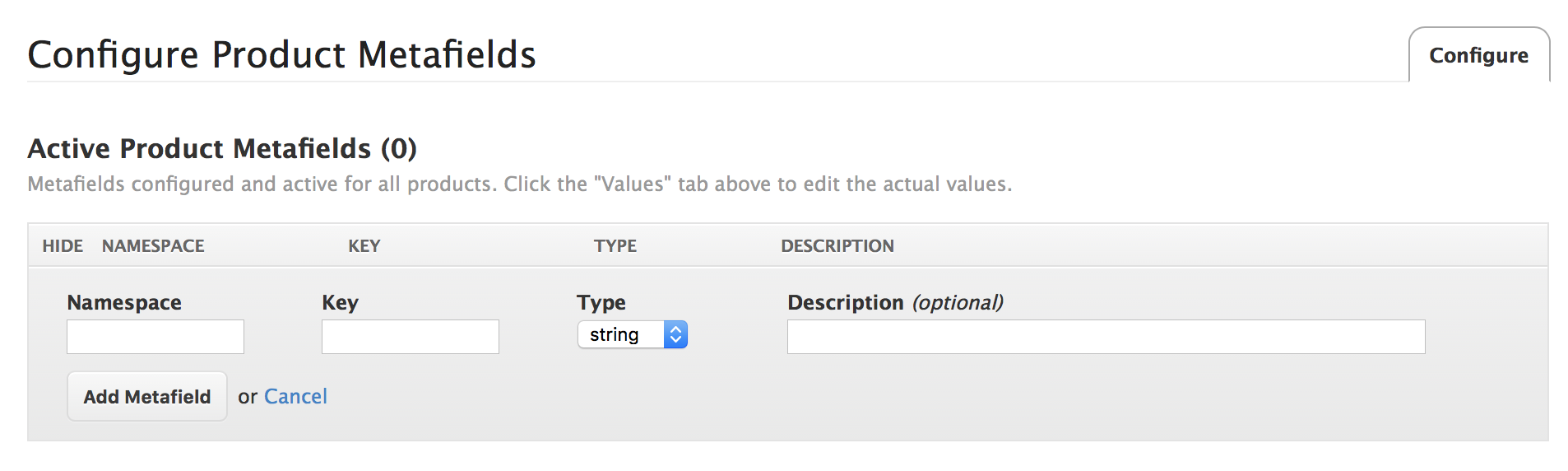 In 2021, Shopify updated available "types" for metafields, deprecating the "string" type used by ShipperHQ. If using Metafields2, set new metafields to "singlelinetext_field". Both types work with ShipperHQ.