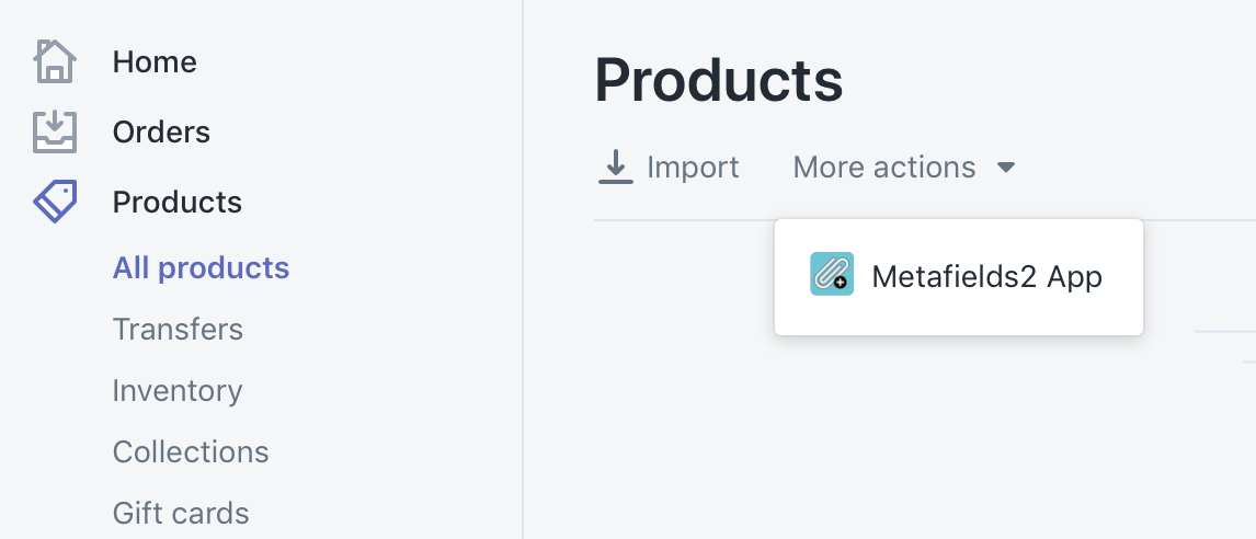 - Go to your Shopify dashboard, click Products, More Actions, then Metafields2 App.