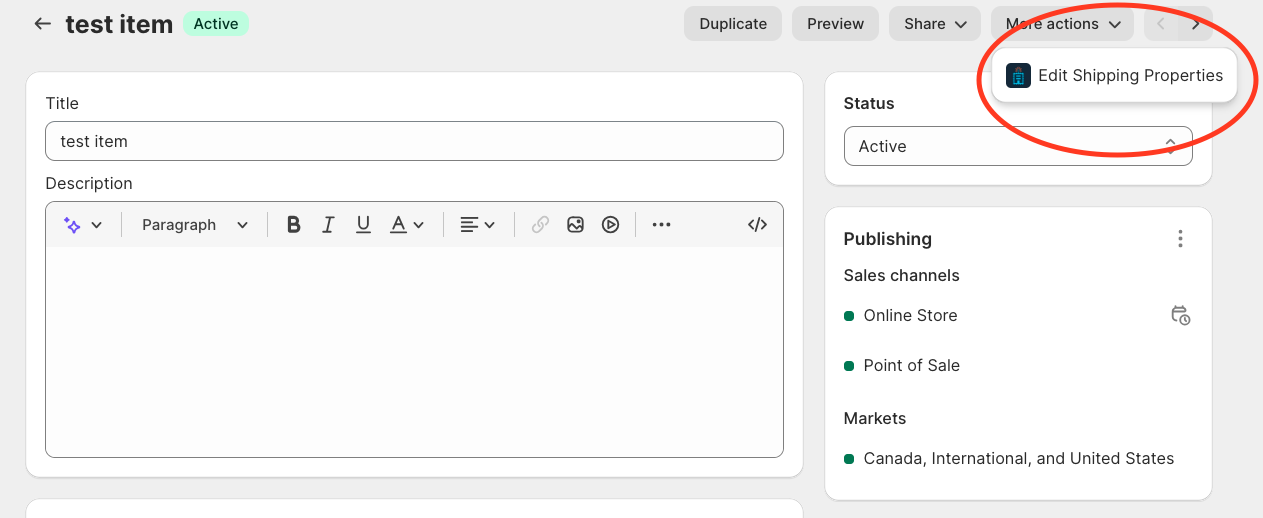 - Under the "More Actions" dropdown on your product details, click "Edit Shipping Properties".