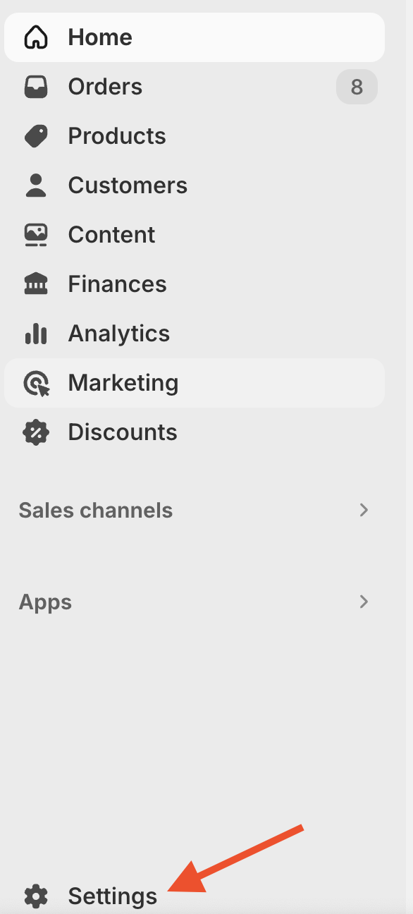 - From your Shopify dashboard, go to Settings.