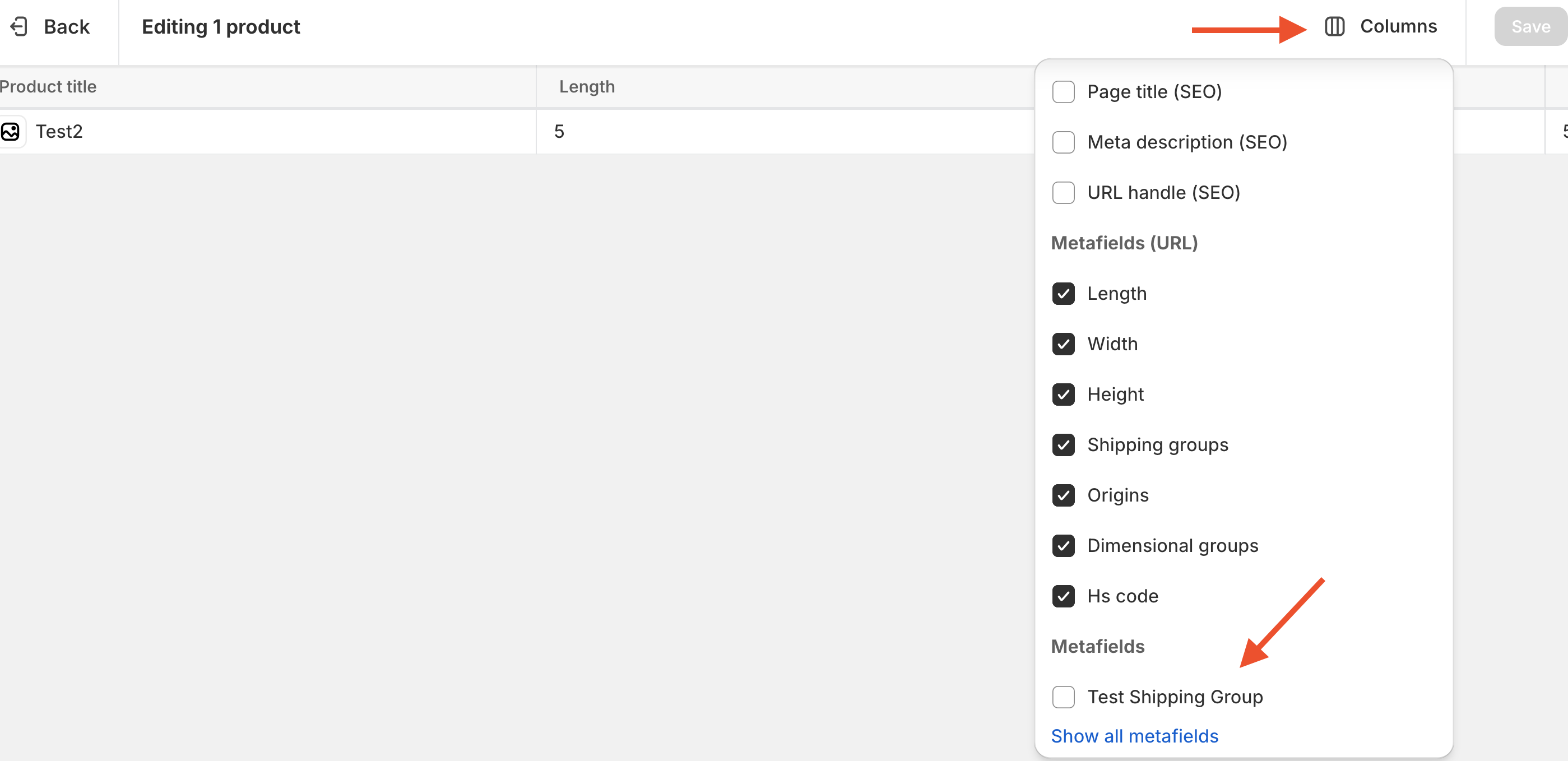 - Click the Columns link in the product editor. Add the new metafield description as a product column.