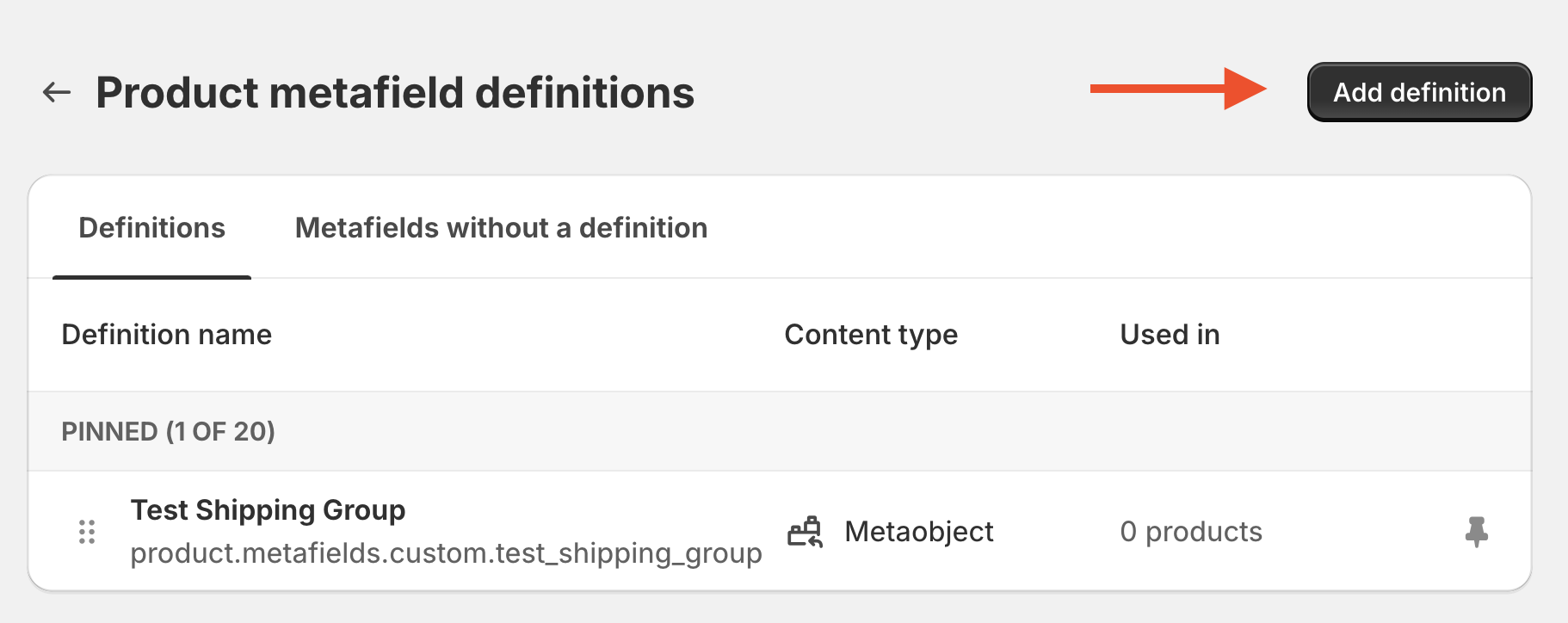 - Under Metafield Descriptions, choose Products, then Add Definition.