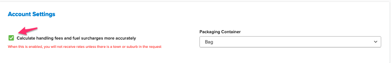 Australia Post eParcel won't return rates for shipments exceeding a maximum of 22 kg without ticking "Calculate handling fees and fuel surcharges more accurately" in the carrier's basic tab, allowing more accurate rate returns. This also enables the city field in the cart estimator for better accuracy. Manage this in Basic Tab > Account Settings.