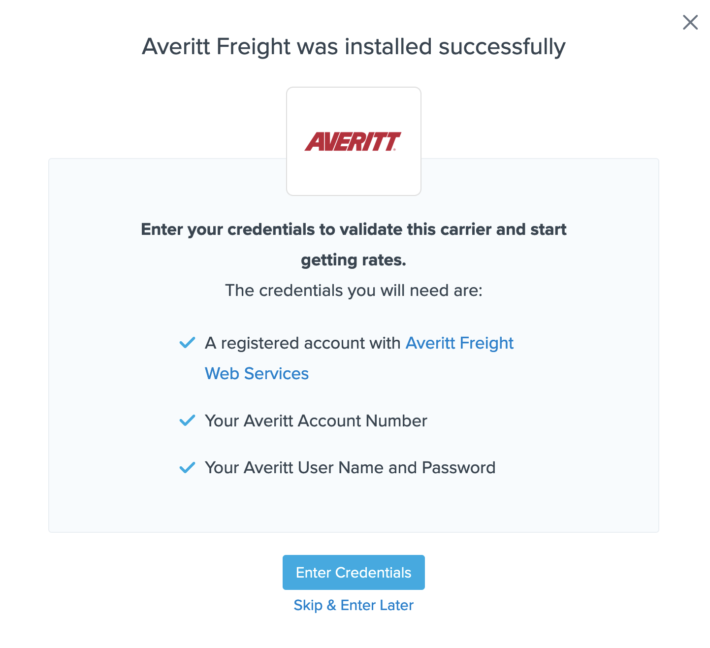 Once you have entered the account number, username, and password, ShipperHQ will validate the information with Averitt Freight. If everything is correct, you will receive a notification that the carrier has been installed successfully.