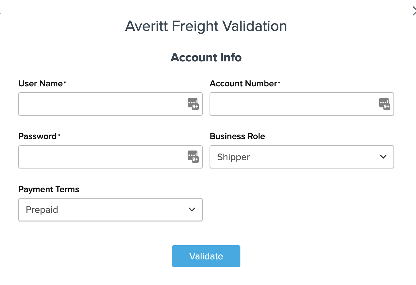 Ensure you have your Averitt Freight Account Number, Username, and Password ready. You can contact Averitt Freight to create an account and obtain these details.