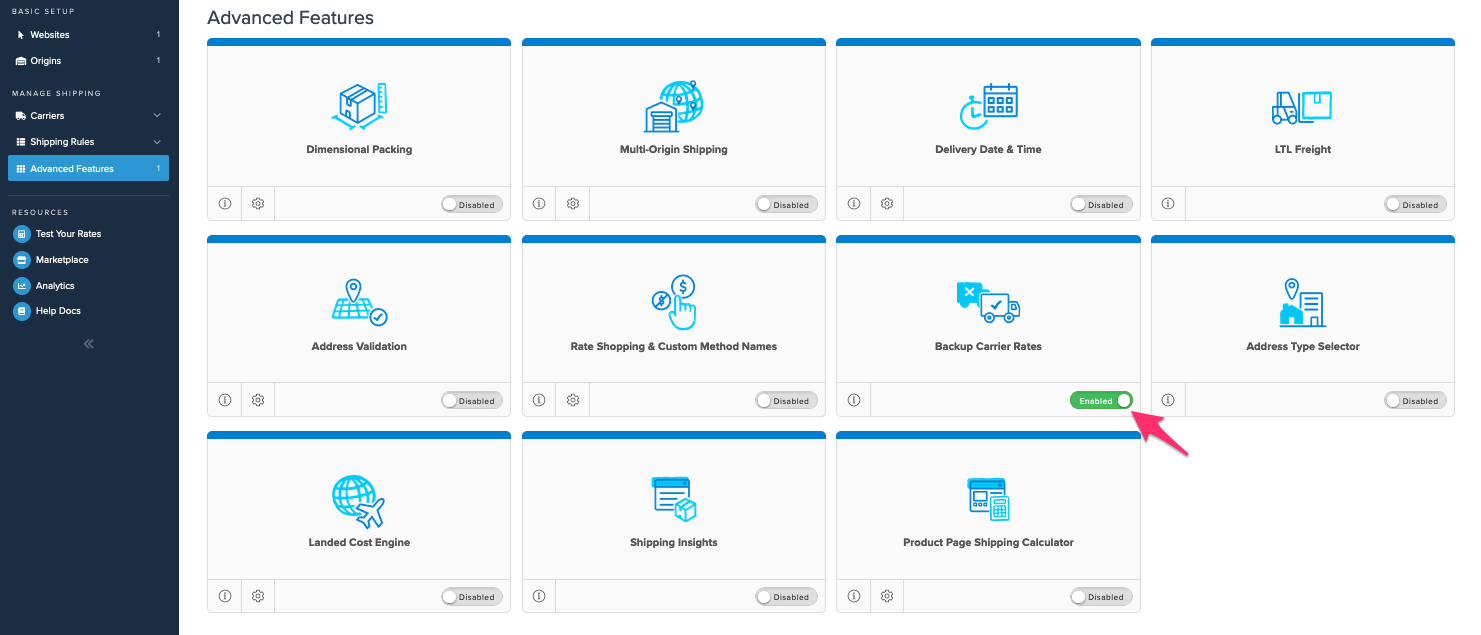 - Toggle the switch on the Backup Carrier Rates panel to enable the feature.