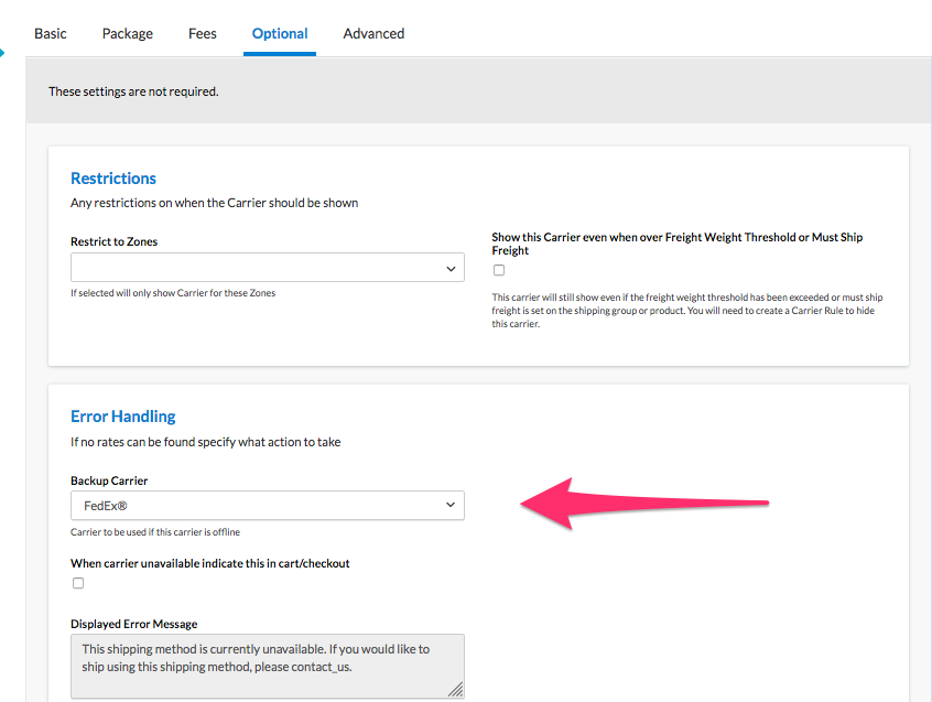 - If you are using Magento, you have the option to display a message when the carrier doesn't return rates. Choose "When carrier unavailable indicate this in cart/checkout."