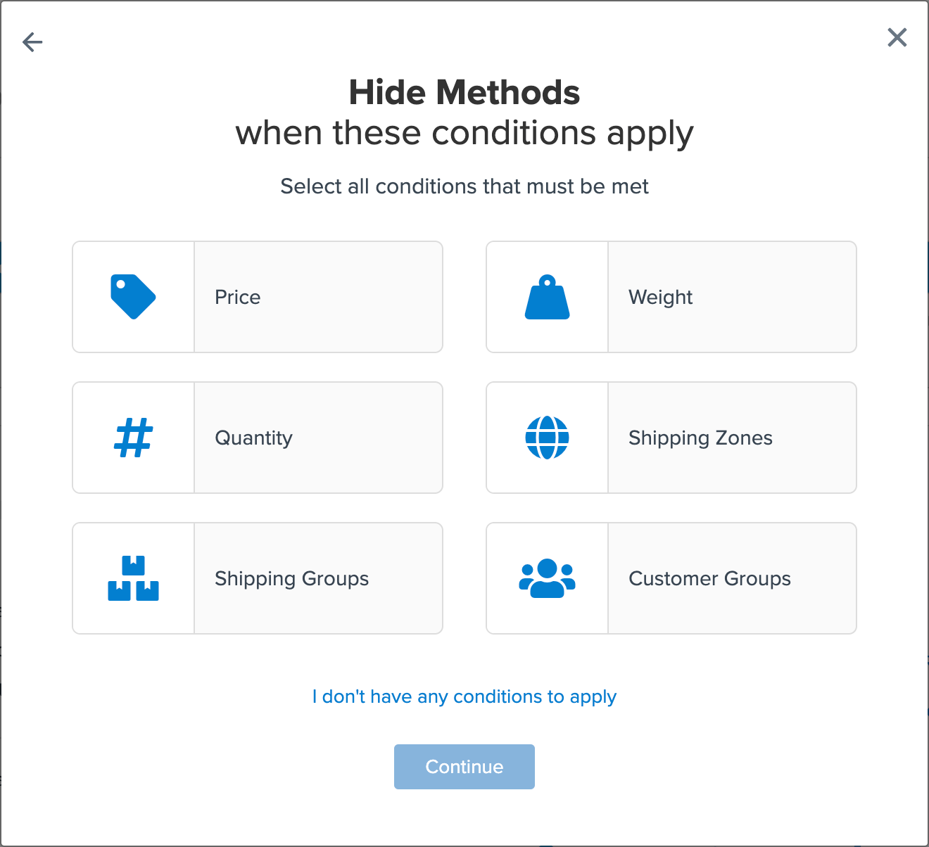 Specify the conditions that must be met for the action to apply. Conditions can include Price, Weight, Quantity, Shipping Zones, and Shipping Groups. You can also enable Customer Groups as a condition under shipping rule settings.