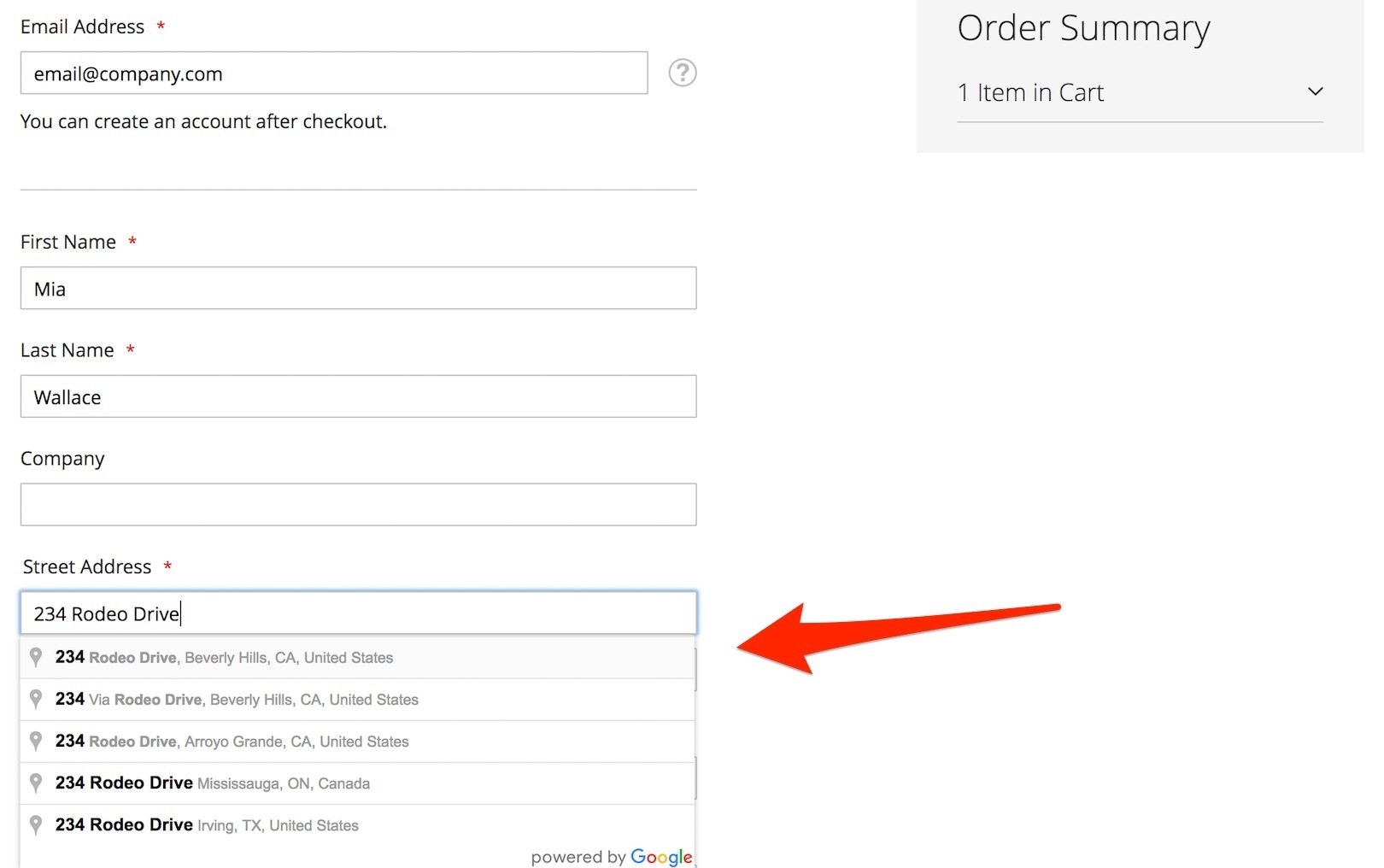- Customer chooses a suggested address, and the address is populated into the form automatically