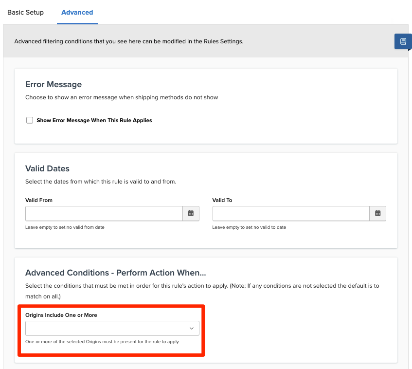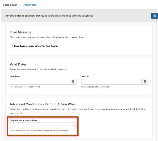 When creating or editing a shipping rule, use the Advanced tab to specify which origins the rule applies to. Select the origin (or origins) that correspond to the website where you want the rule to apply.