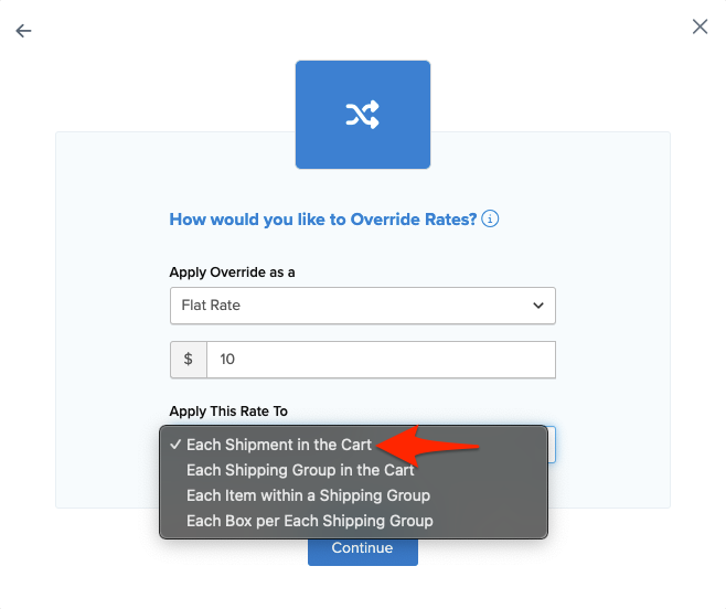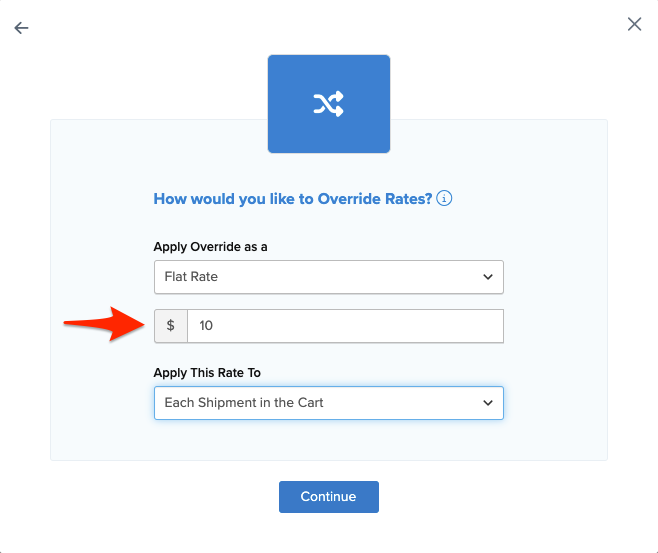 - Specify the Override by selecting Flat Rate from the dropdown. Enter your desired amount, like $10, to set the flat rate.