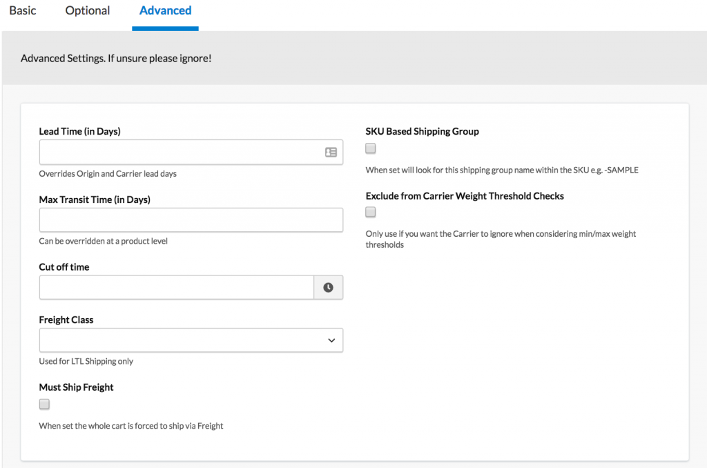 - Shipping Group: Under Shipping Groups > Advanced (overrides Carrier and Origin lead times)