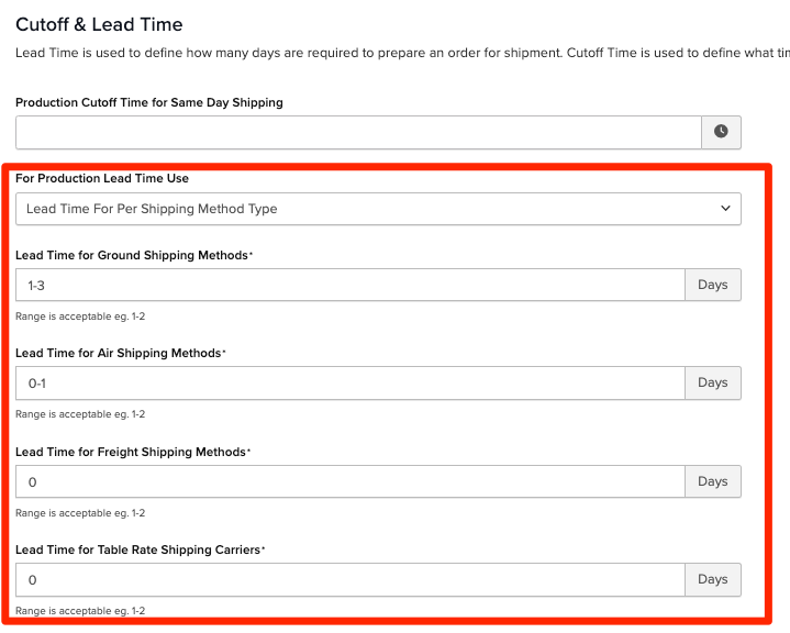 Lead Time specifies the number of days required to prepare an order for shipment. It can be set on the Origin, Carrier, or Shipping Group level: