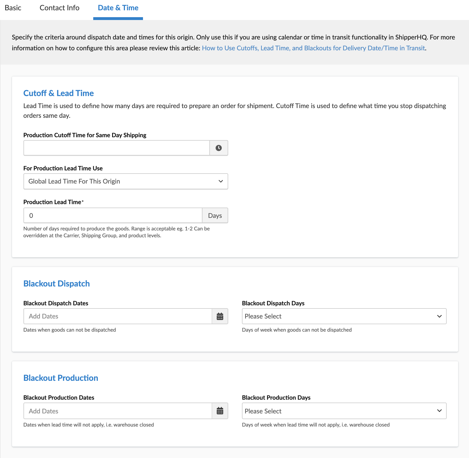 Once you've enabled ShipperHQ's Delivery Date & Time advanced feature, you'll see a Date & Time tab on your Origins. Here, set the base Cutoff Time for Same Day Shipping, as well as Lead Time and Blackout Dispatch Dates and Days for each origin. Verify that the settings on each origin reflect its specific information.