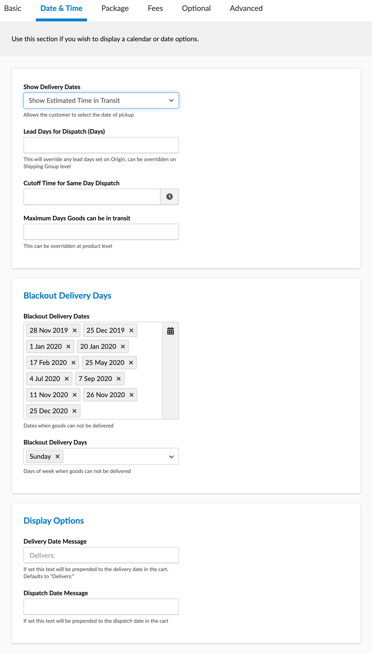 Define days when an origin doesn’t ship orders. Set this typically for weekends or holidays, affecting estimated delivery dates shown at checkout.