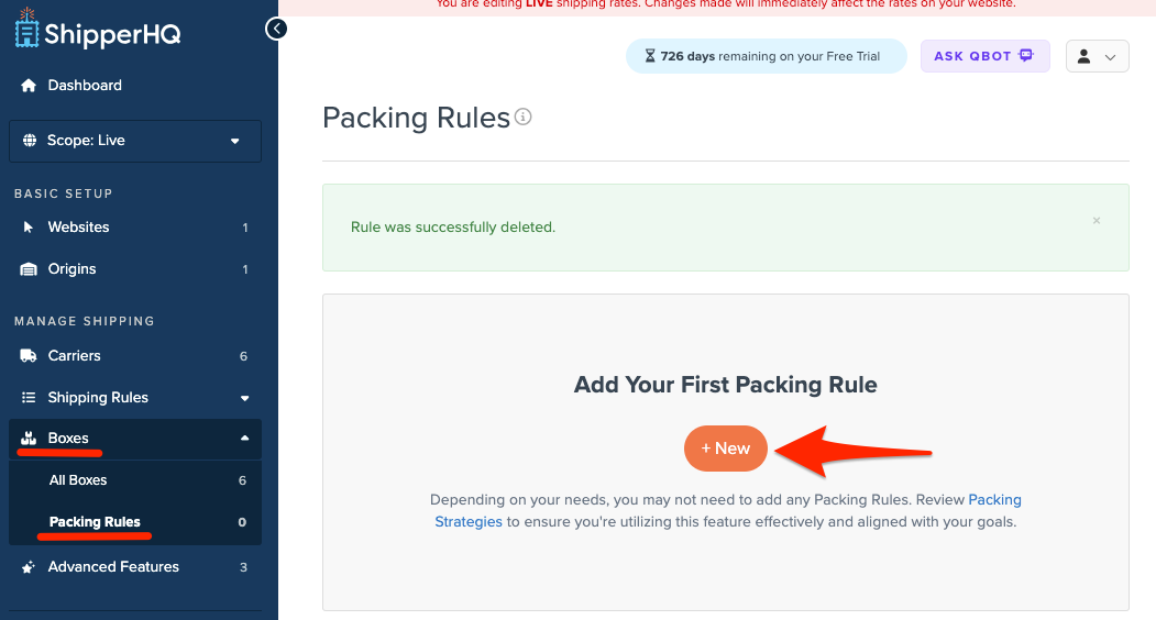 - Once Boxes are set up, navigate to Packing Rules under the Boxes tab. Create a new packing rule via +New.