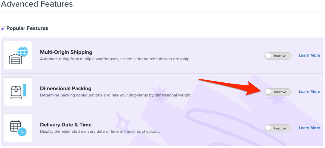 - Enable the Dimensional Packing feature from your Features page in ShipperHQ.