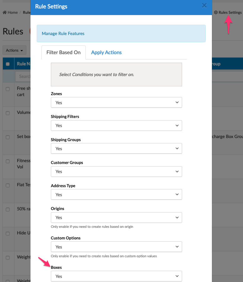 - Go to Shipping Rules > Settings (top right-hand corner) > Boxes > Yes