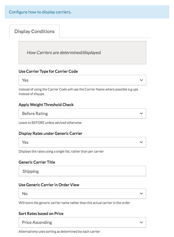- Decide whether to display the actual carrier used for delivery with the setting Use Generic Carrier in Order View. If you select No, the Carrier Title will be shown. For example, if your list includes both FedEx and UPS rates, once an order is placed, the shipping method might say "UPS - Ground."