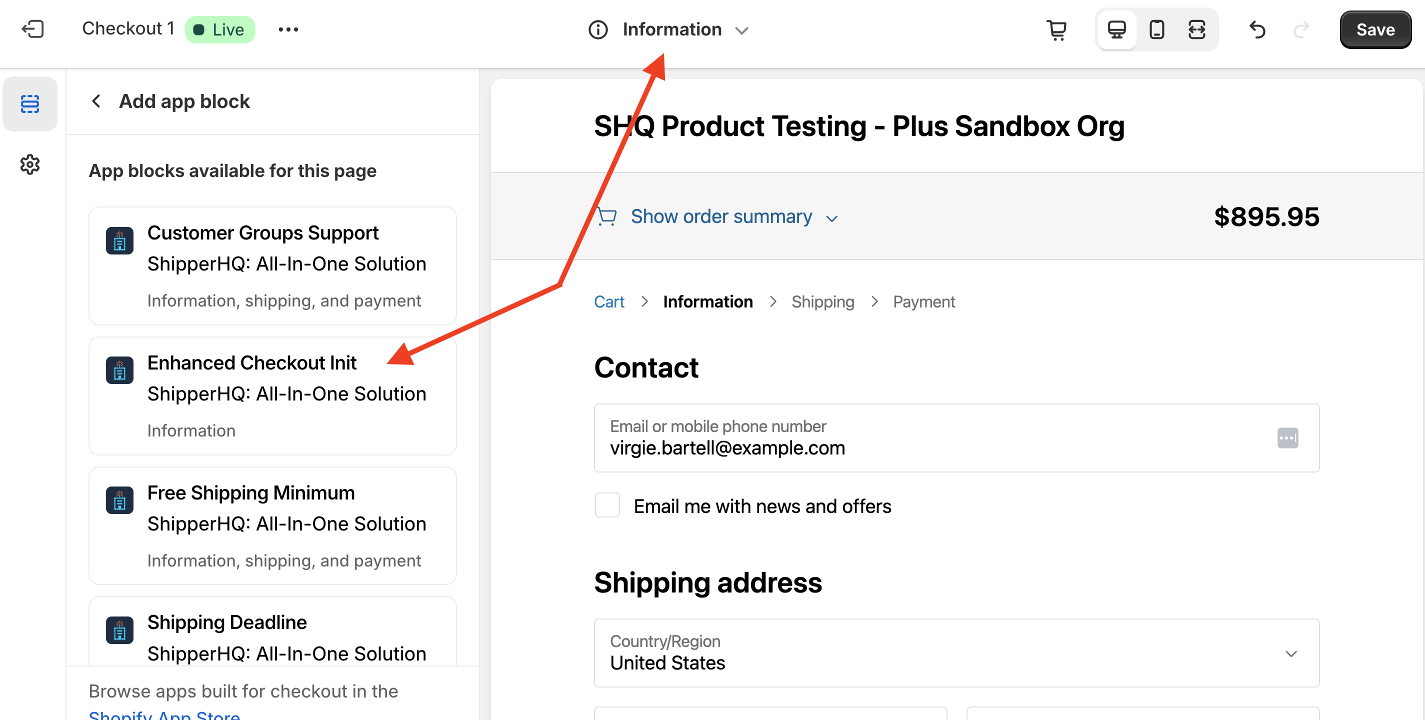 - Ensure the Enhanced Checkout Init app block is installed under Information and Enhanced Checkout v2 is set up.