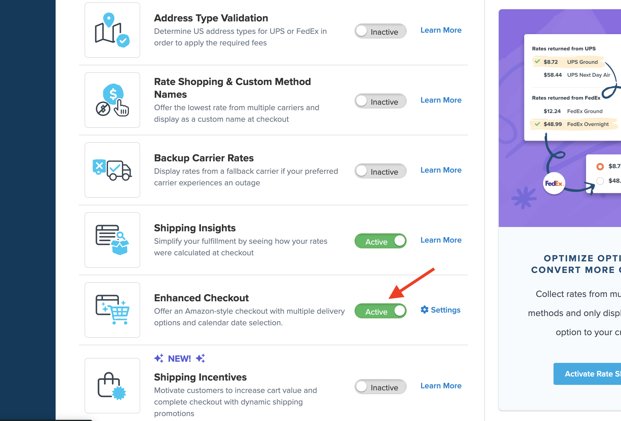 Enabling Enhanced Checkout will automatically enable Shipping Insights if not already active. Note that this will count as two features if your ShipperHQ plan limits the number of advanced features you can enable.