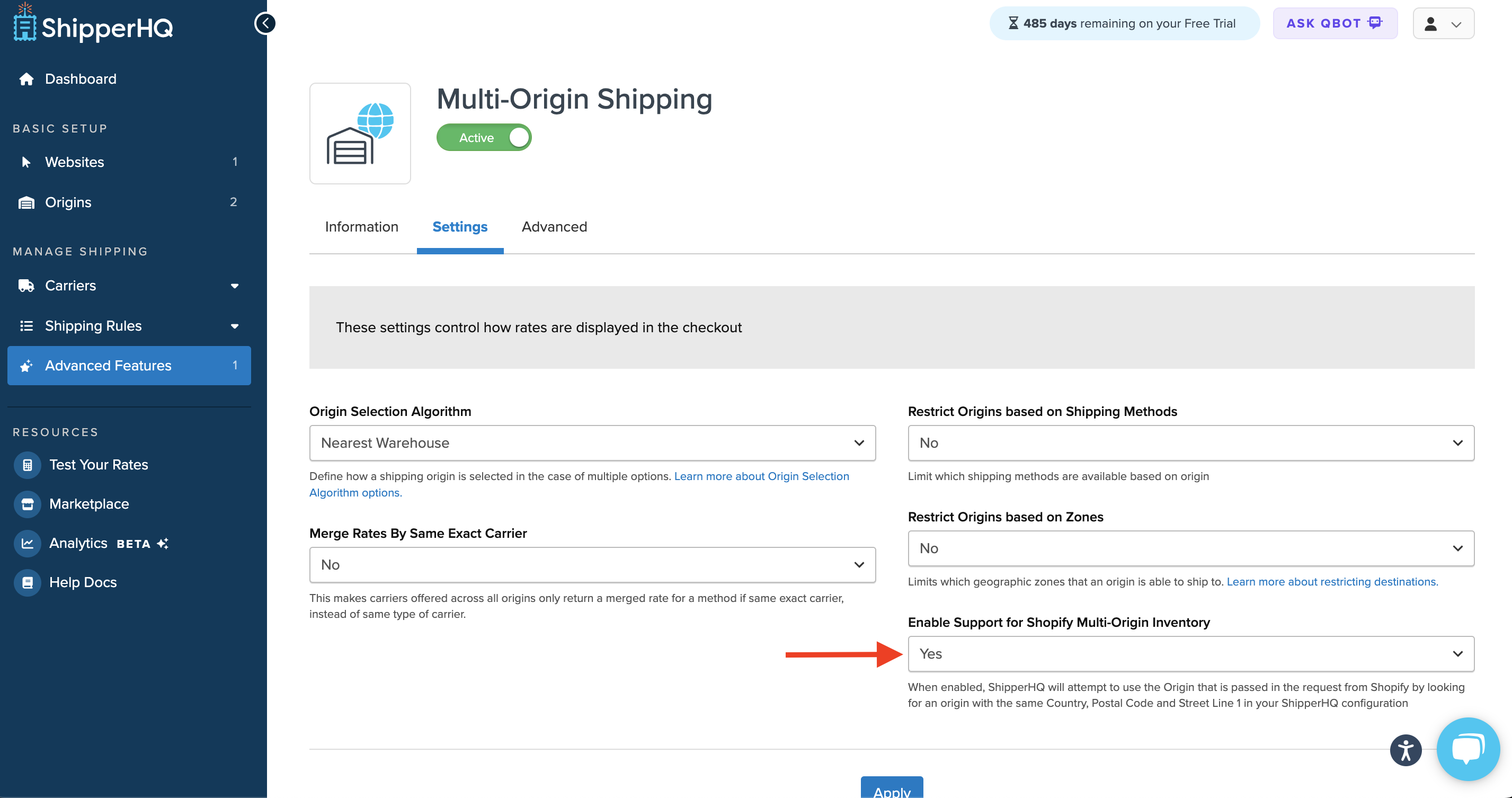To enable Shopify's Multi-origin inventory with Enhanced Checkout, toggle this feature under the Multi-Origin Advanced Feature > Settings Tab in your ShipperHQ dashboard.
