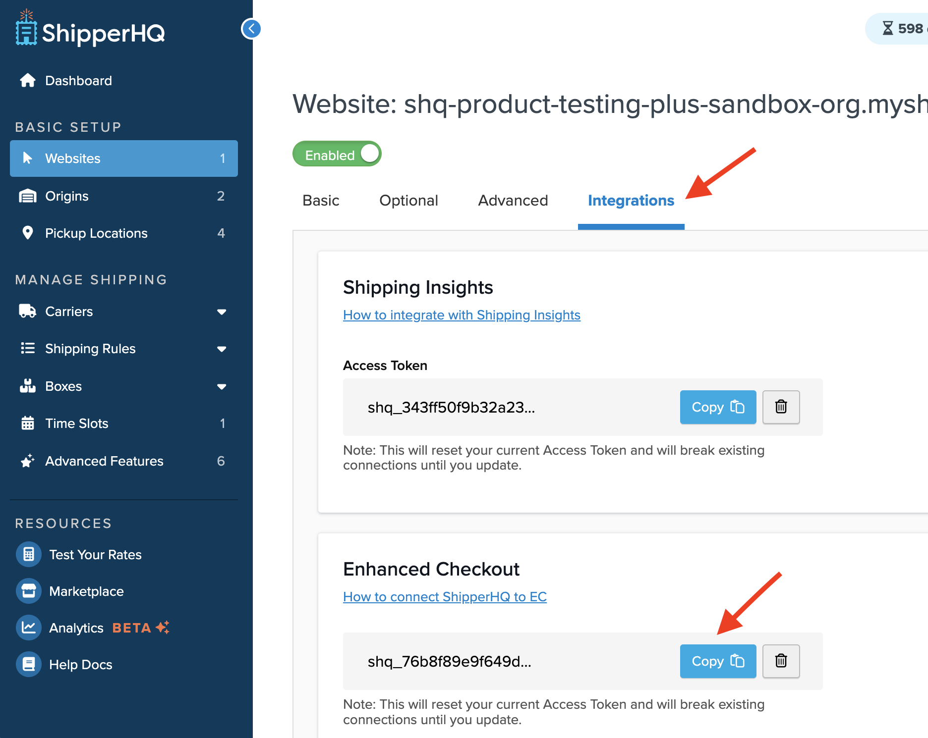 - Click the Integrations tab at the top of the website page and copy the access token found under Enhanced Checkout.