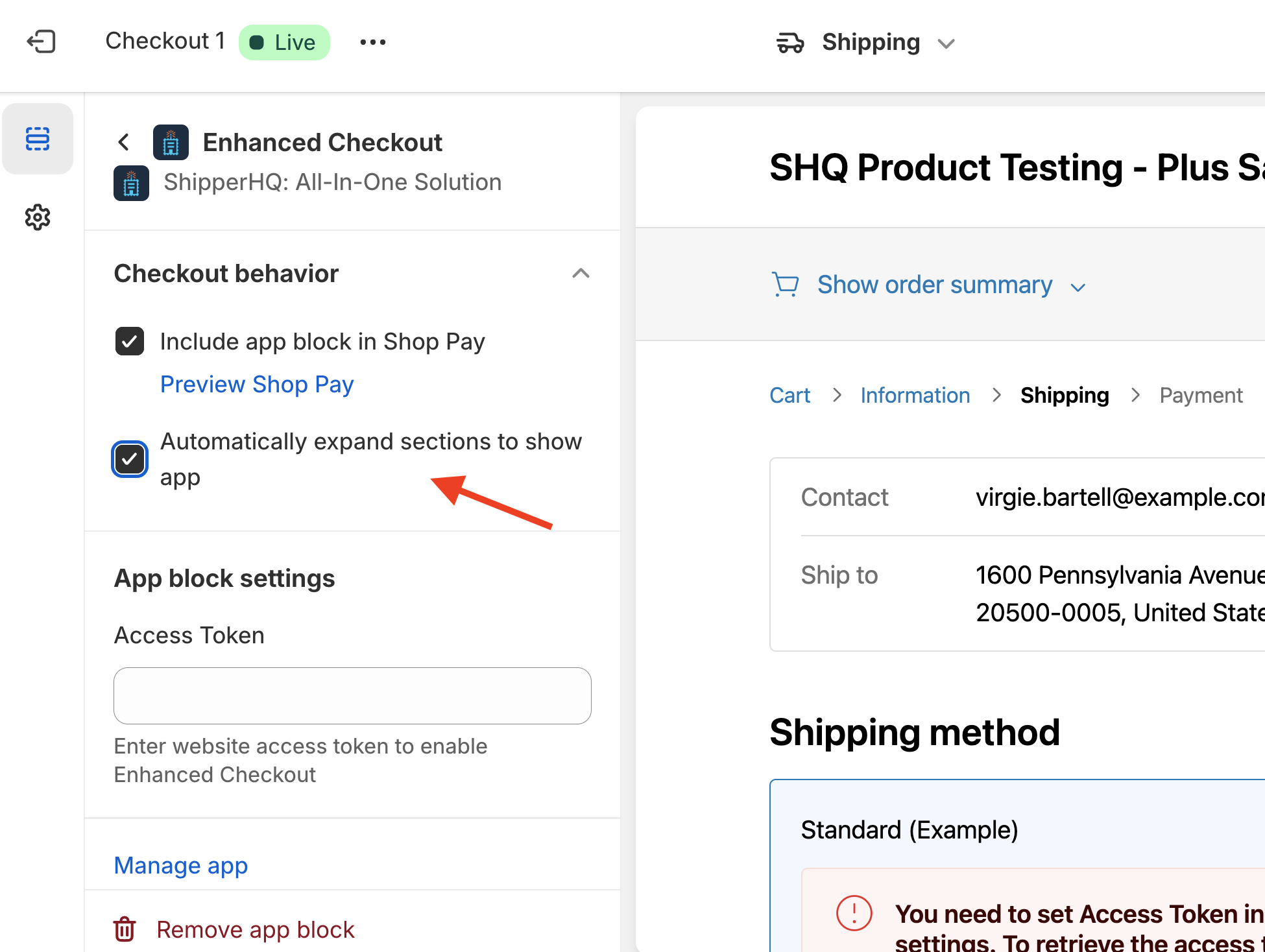 - Check both Include app block in Shop Pay and Automatically expand sections to show app if you plan to use Enhanced Checkout with Shop Pay express checkout.