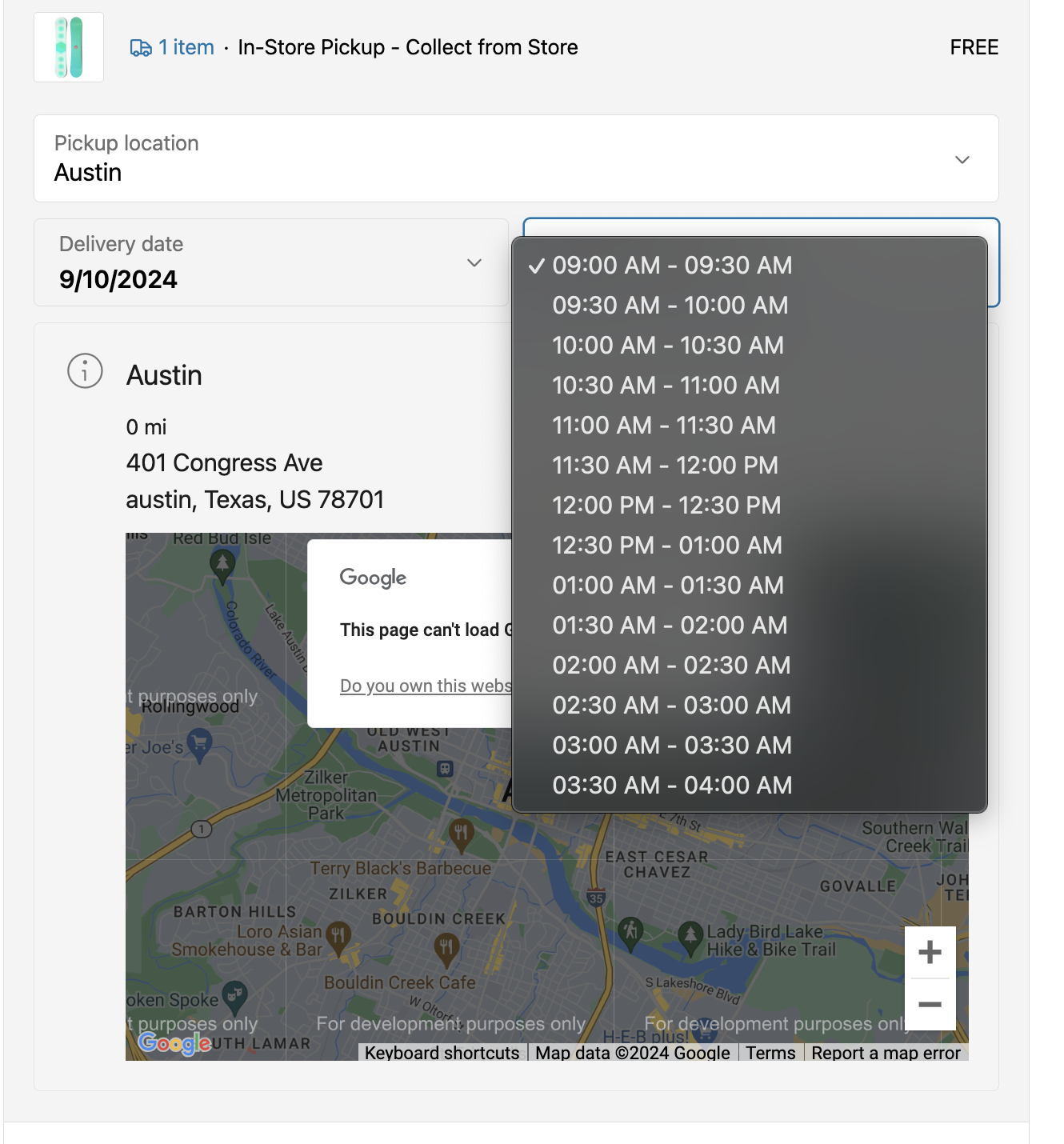 Customers can view available pickup time slots and a map of the pickup location at checkout.