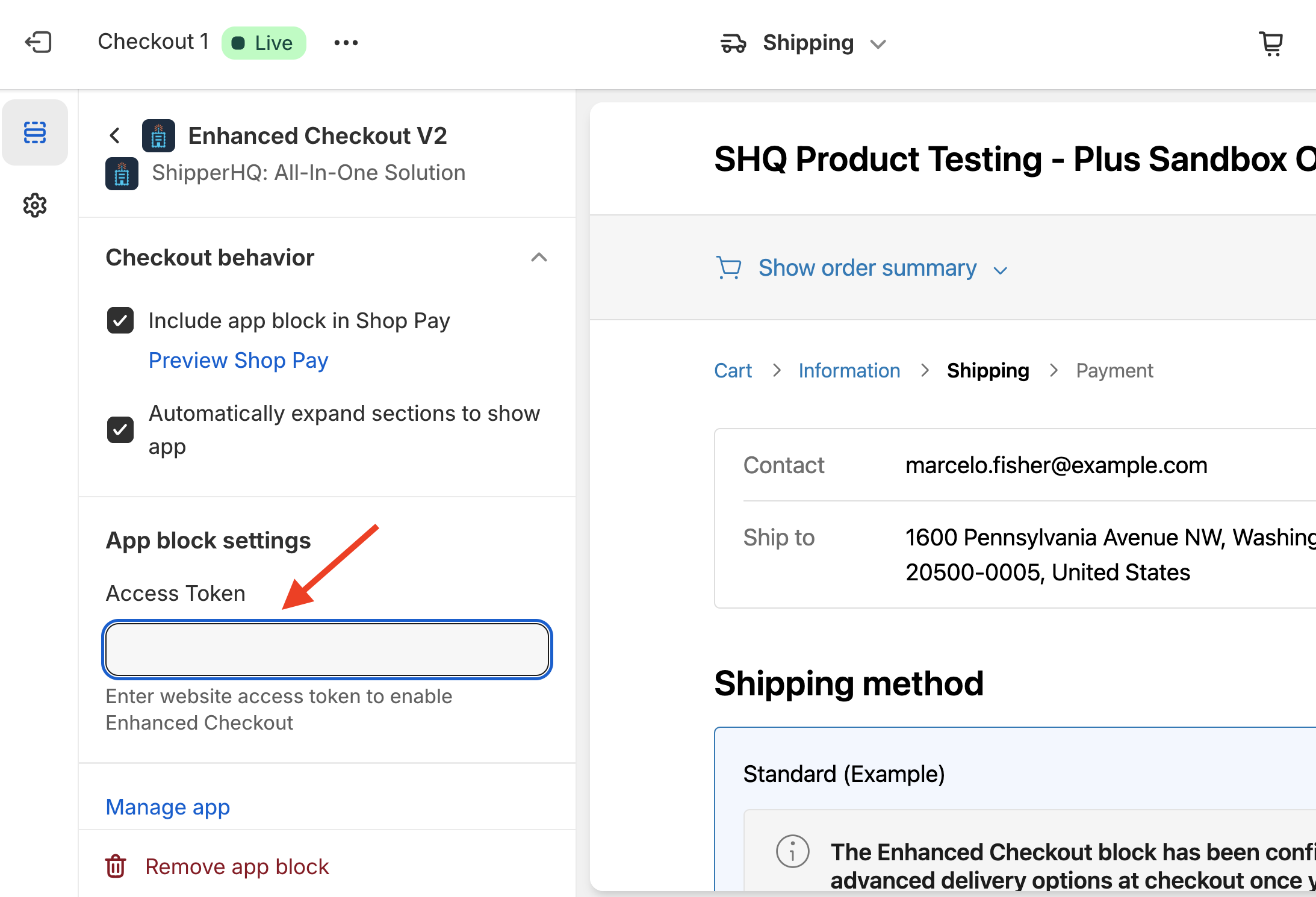 Enhanced Checkout is compatible with Shopify's standard and Shop Pay express checkout. Both the Include app block in Shop Pay and Automatically expand sections to show app checkboxes need to be checked for functionality in Shop Pay.