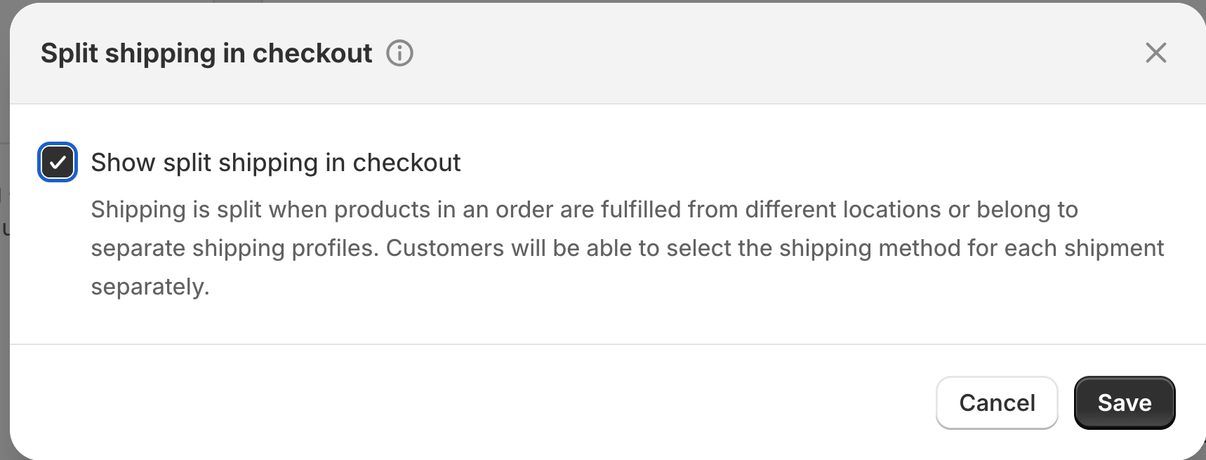 Check Shopify’s documentation for enabling Split Shipping. If unavailable, contact your Shopify Account Manager.