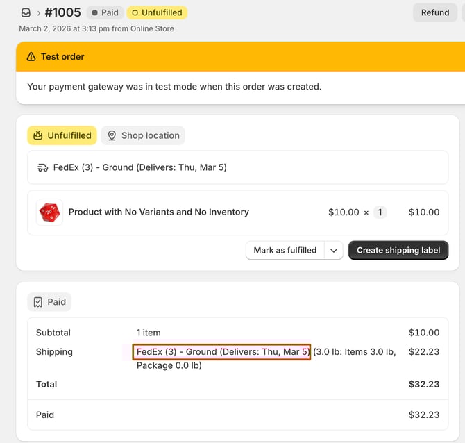 - When the order is placed, ShipperHQ places the Carrier Name, Method, Delivery Date and Time, and Duties and Taxes, on the same line, under Shipping. Shopify calls this the "Title" for Shipping.