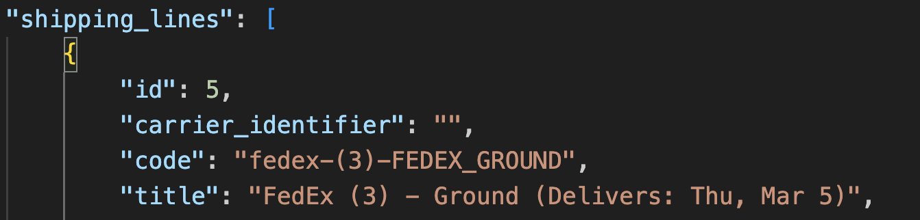 - Either API above, will return the "title" key from Shopify, which will contain the carrier, method, delivery date and time, and duties and taxes, on the same line.