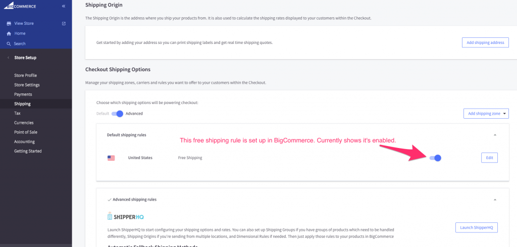 Disable unwanted BigCommerce free shipping options to align with your ShipperHQ settings