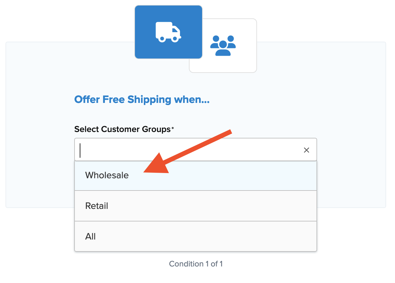 - Select the customer group(s) that will be used for this rule. For example, select "Wholesale" so that Ground shipping will be presented at no cost for wholesale customers.