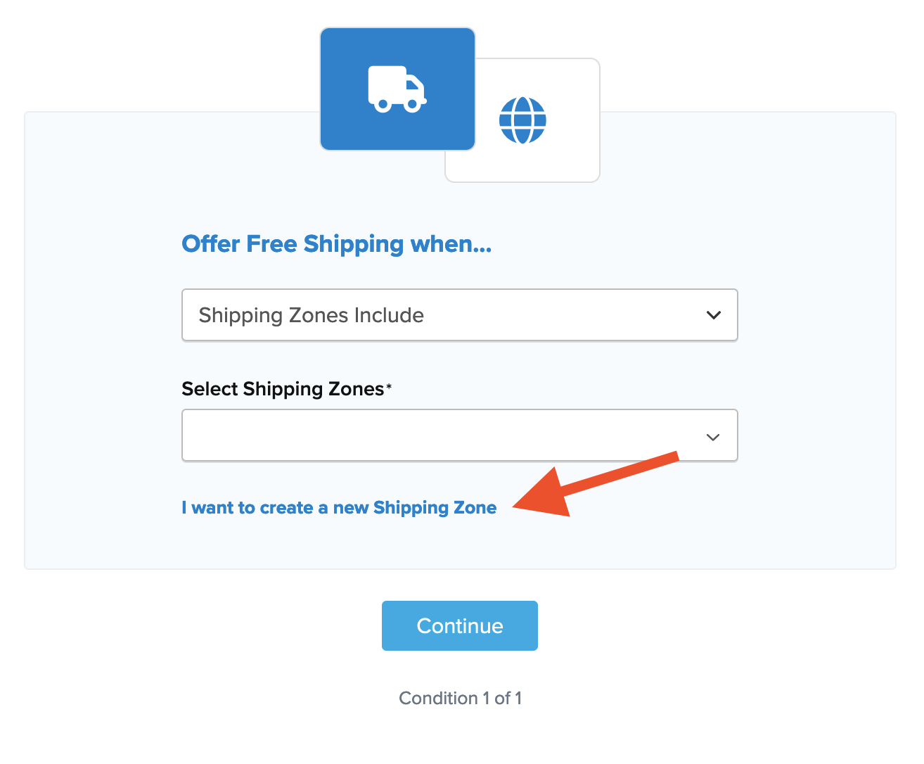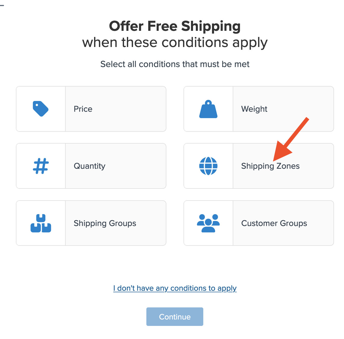- Select Shipping Zones as the condition required for the rule to apply.