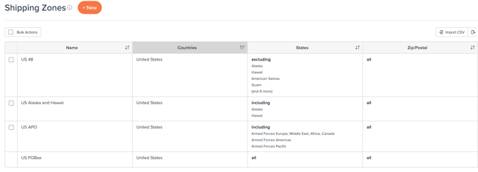 By default, ShipperHQ loads in the US 48, US Alaska and Hawaii, US APO, and US PO Box, zones.
