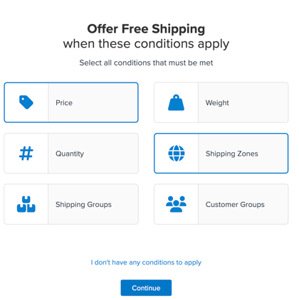 Click Continue. Under Offer Free Shipping when these conditions apply, select Price and Shipping Zones as the condition.