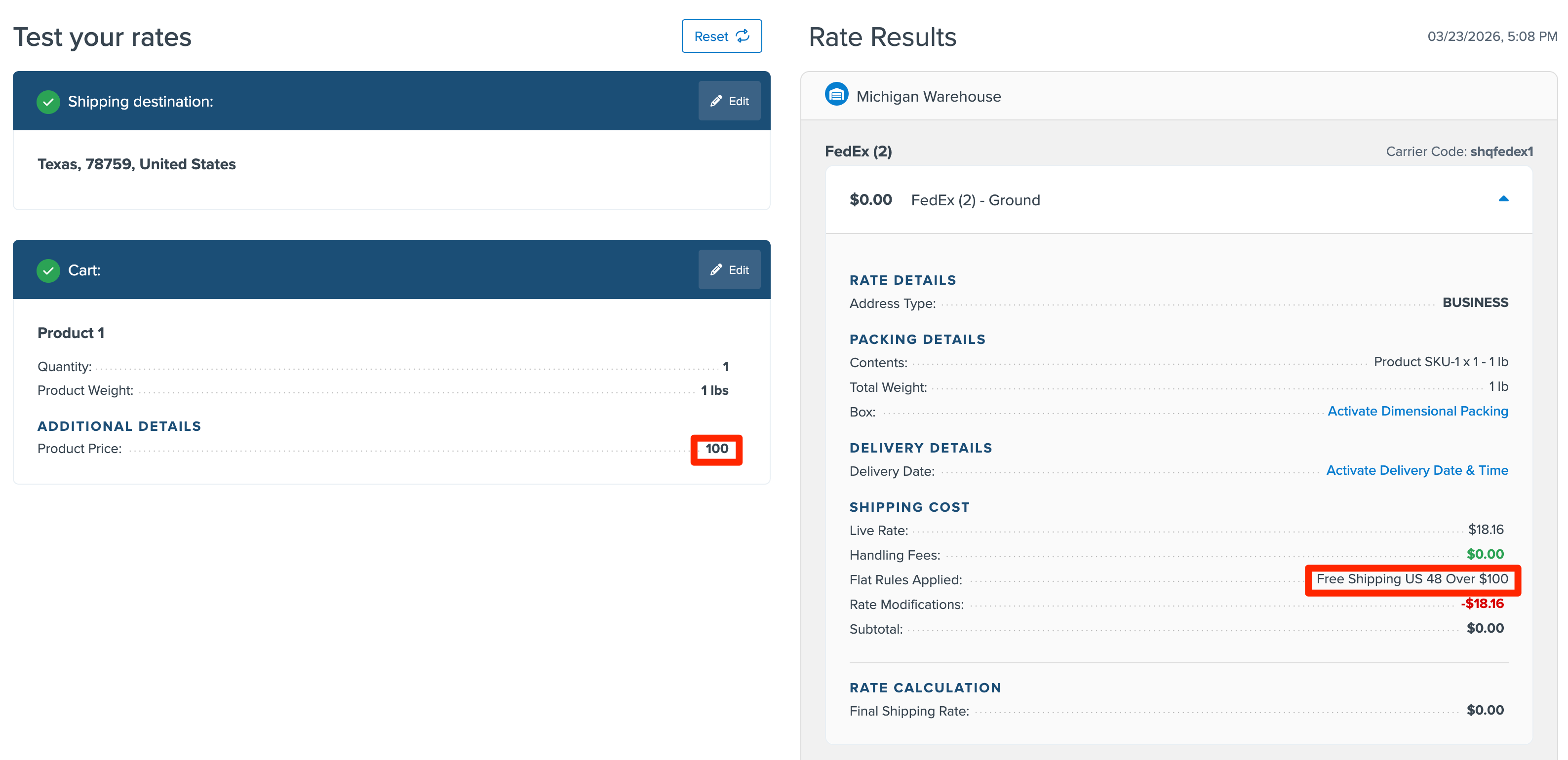 Go to Test Your Rates in the ShipperHQ dashboard, enter a continental US address, add products totaling $100 or more, and verify the shipping methods show as free.