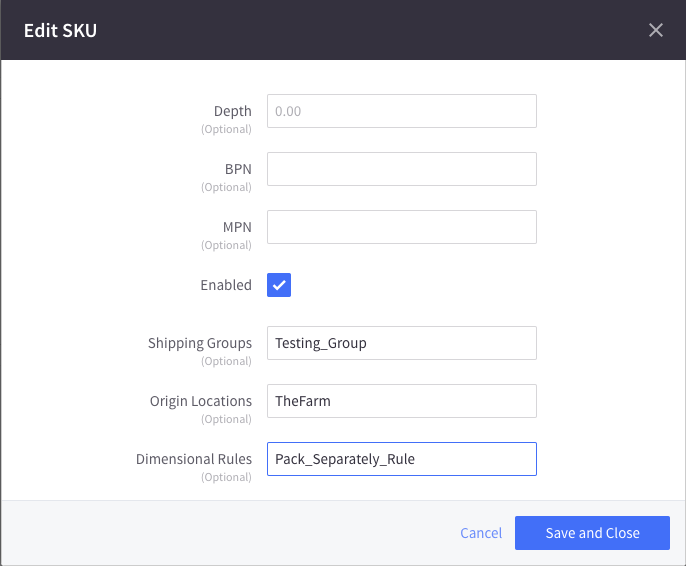 Copy/paste the exact name of your Shipping Group, Origin, or Packing Rule (Dimensional Rules) into the relevant field.