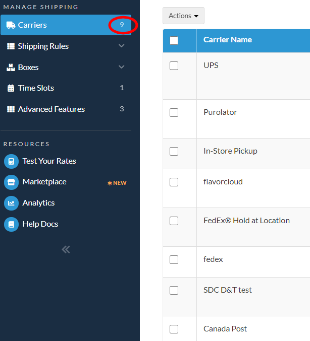 You might encounter "hidden carriers" where ShipperHQ indicates a certain number of carriers are set up, but the list doesn't match that count. In the screenshot below, the "Carriers" tab states there are 9 carriers, but only 8 are shown.