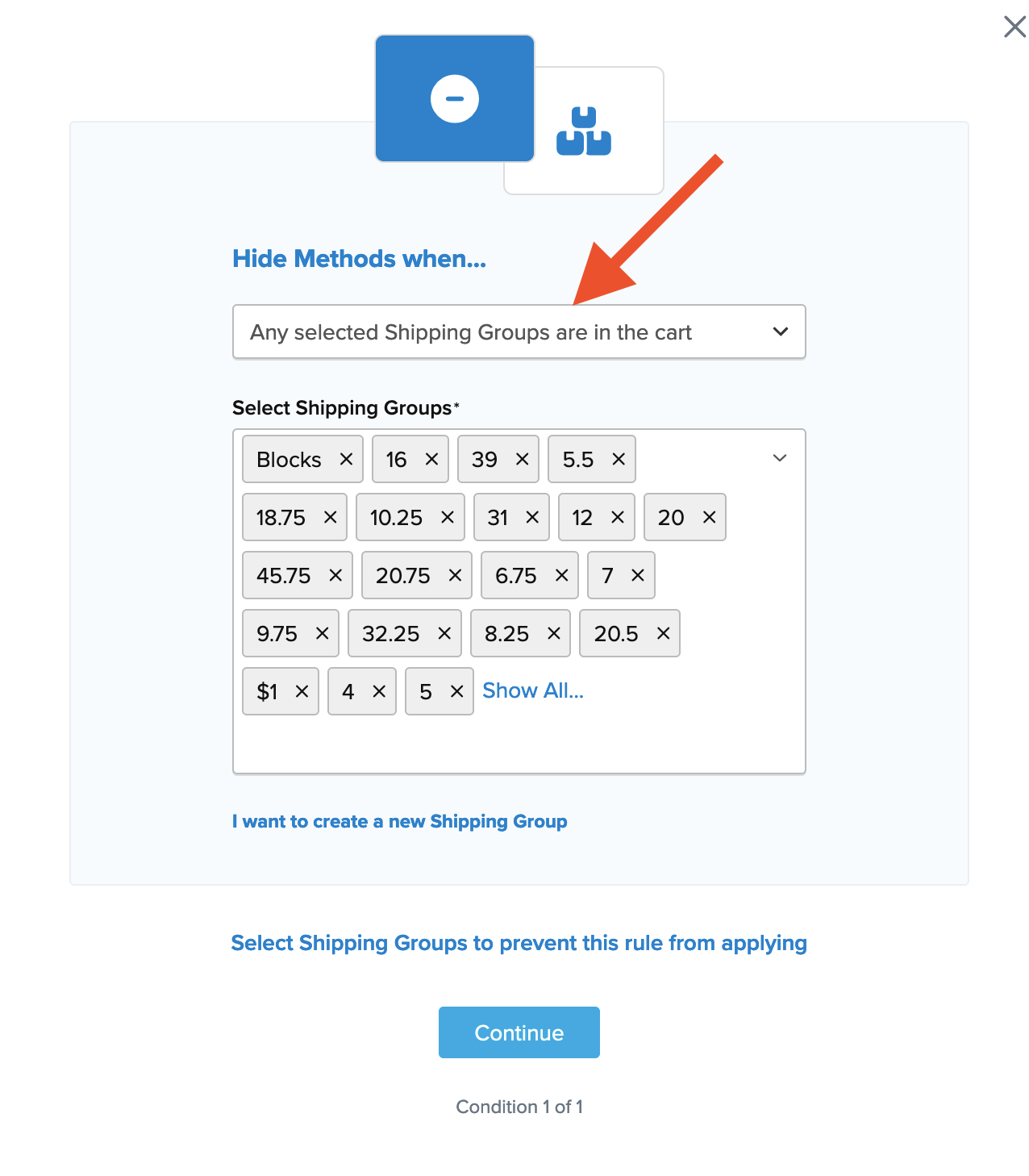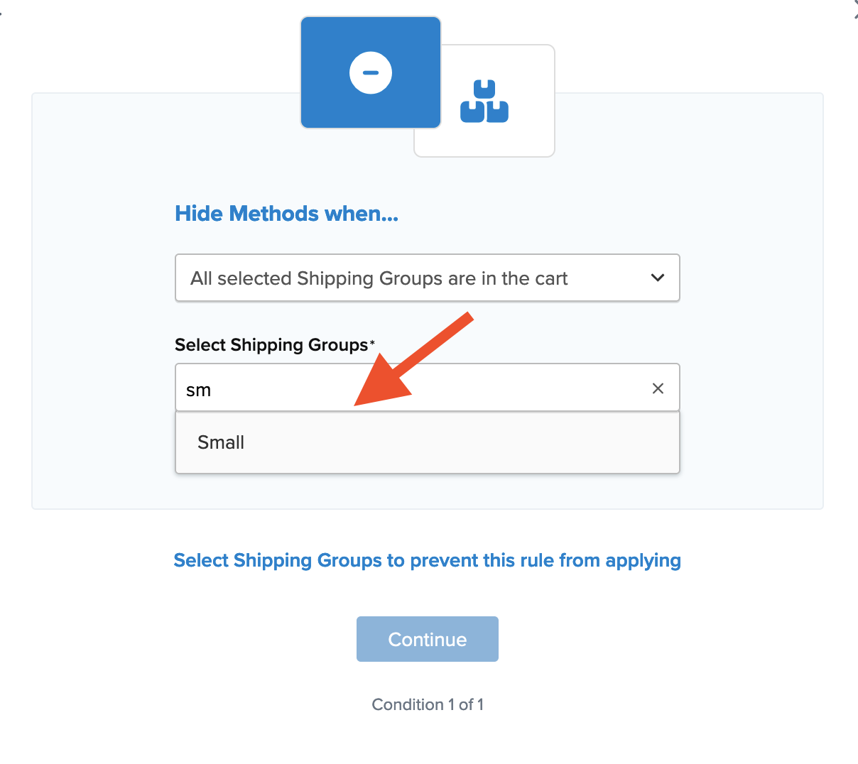 - Edit the Conditions to remove the Small group and assign remaining groups. Set to "Any Selected Shipping Groups Are in the Cart."
