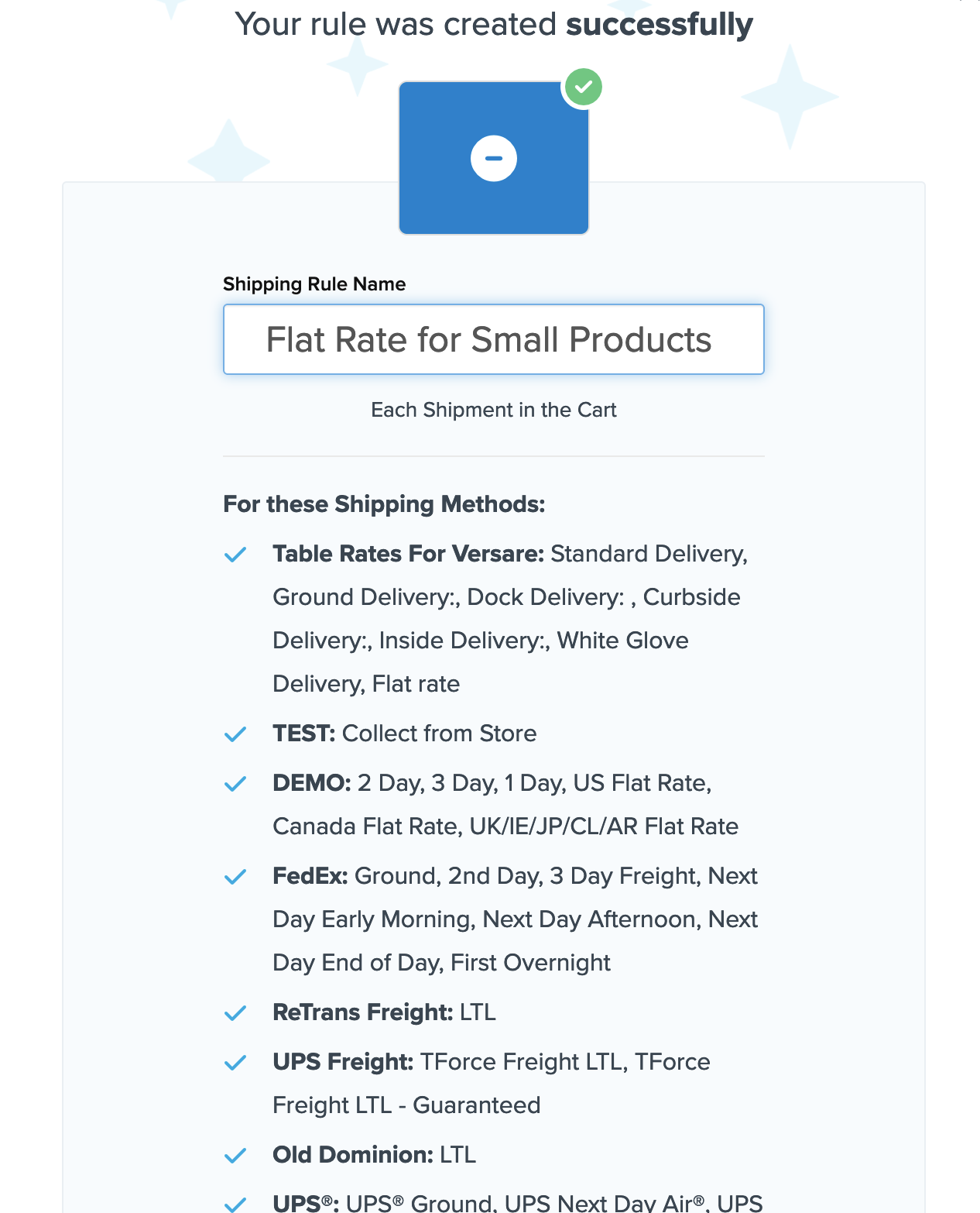 - Click Continue, then Save the rule. Flat Rate will show only when items in the Small group are alone in the cart.