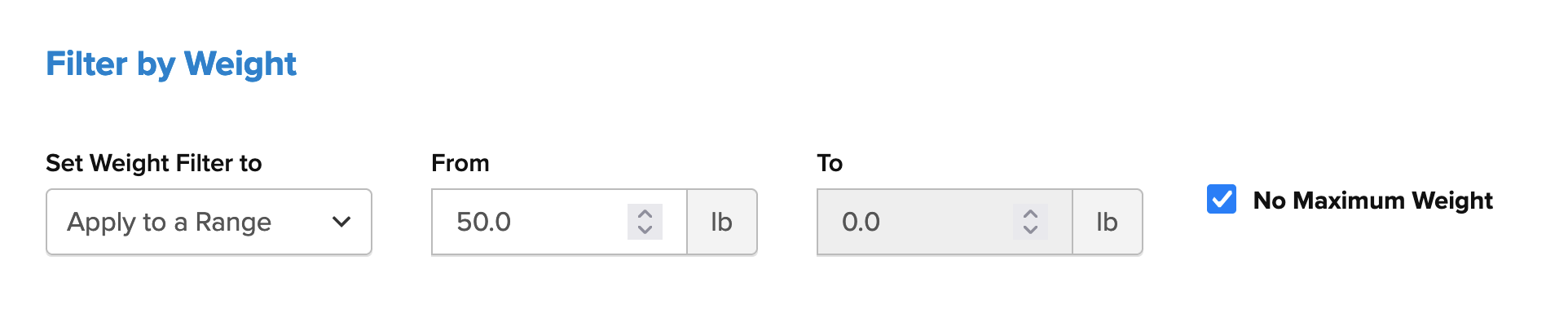 - Set a Weight Range of 50 LBs, with No Maximum Weight.