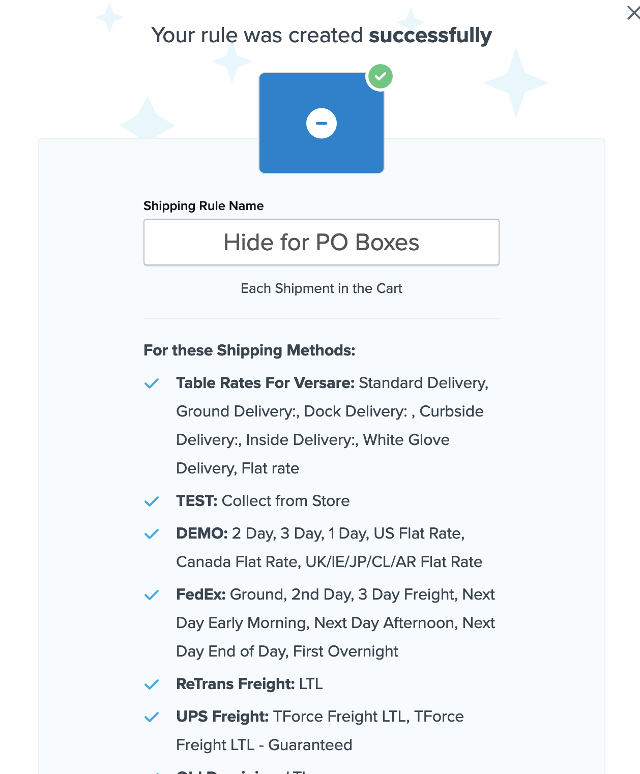 - Once the rule is created, we recommend using the “Test your Rates” feature to confirm the setup. With this Shipping Rule, all selected shipping methods will hide if the customer enters a PO Box in the US as their address.