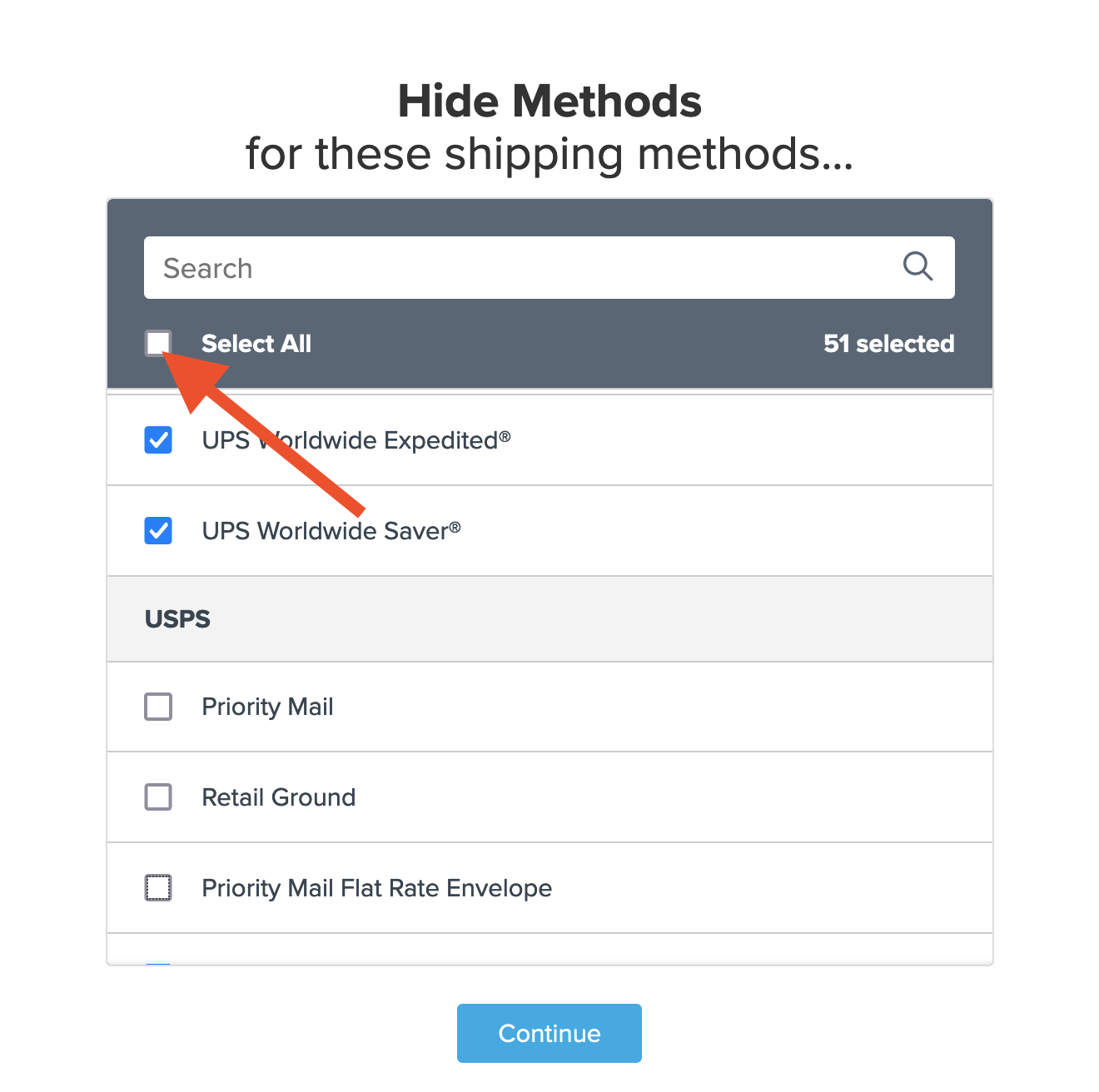 - Select each shipping method to be hidden by this rule. If you have many carriers and shipping methods, it's often easier to select all and then deselect any USPS methods you'd still like to offer for PO Box addresses