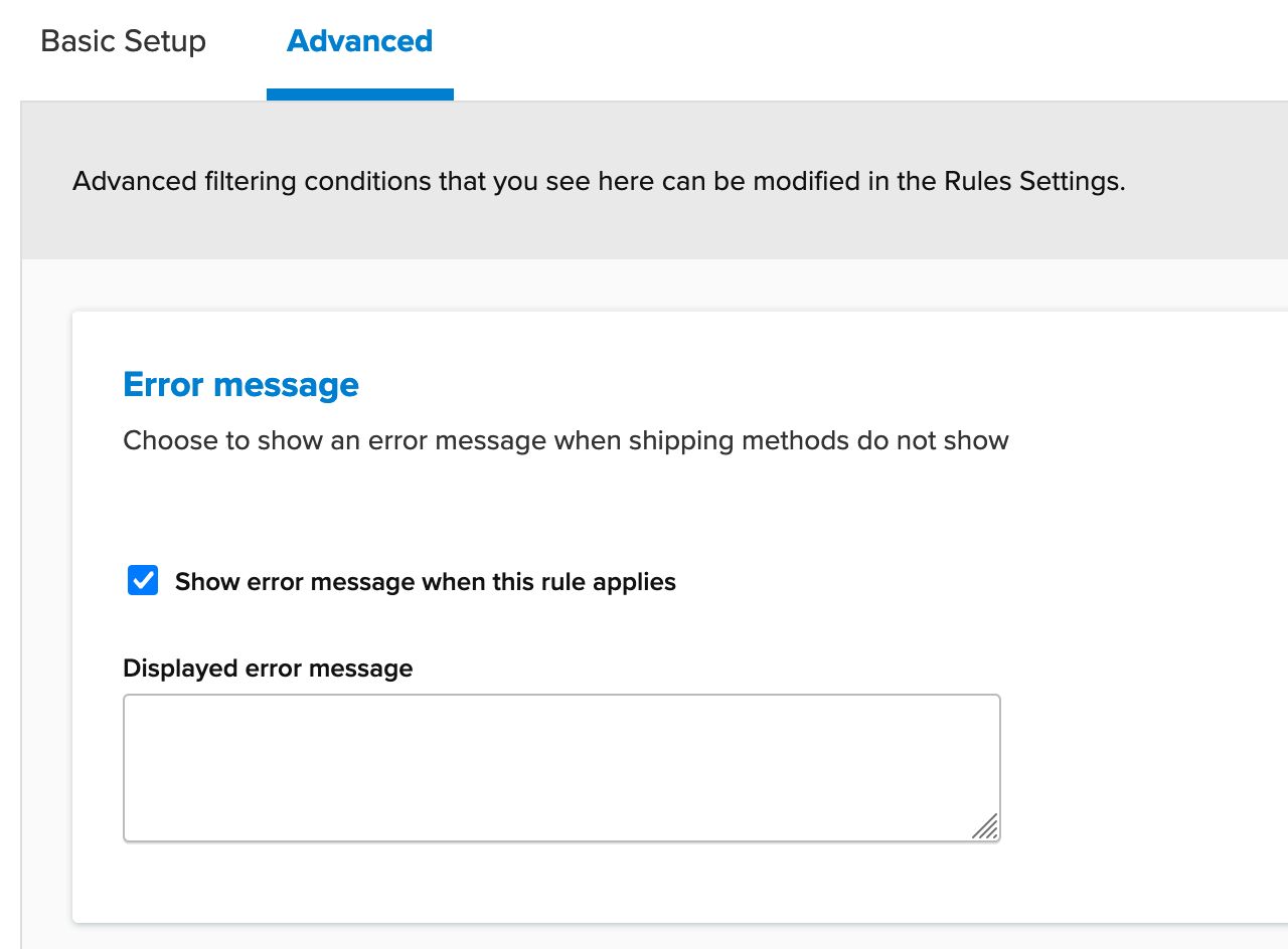 For Magento platforms, when a rule is set to "Hide Shipping Methods," you can also set an error message to display when the rule is active: