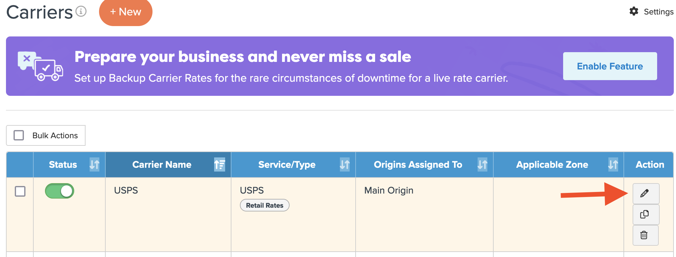 - Click on your USPS carrier or the edit button shown below.